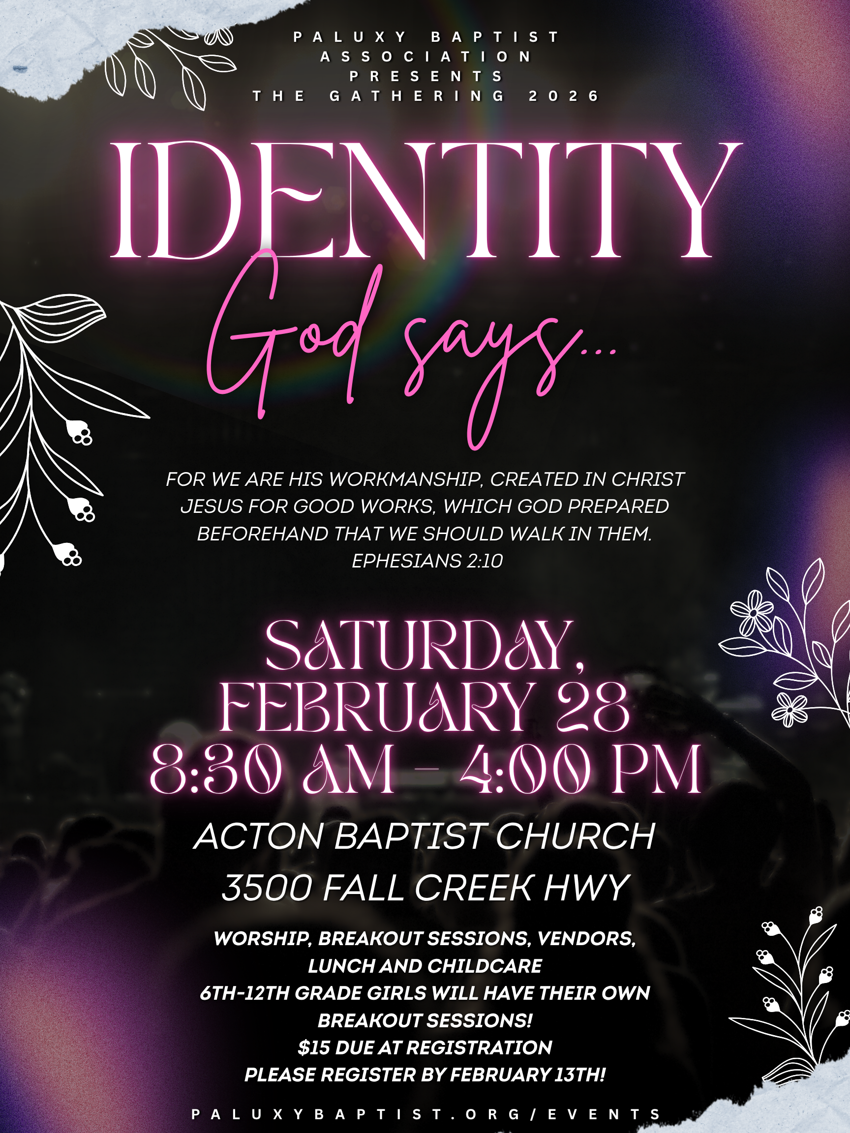 Registration for Ladies Gathering February 28, 2026Acton Baptist Church3500 Fall Creek Hwy, Granbury, TX 76049 This year we are also including sessions for teenage girls, grades 6-12.